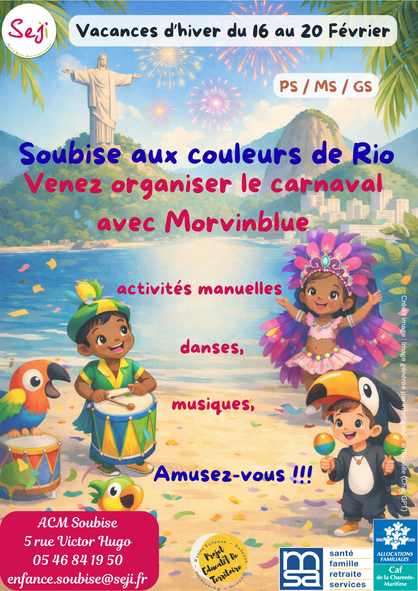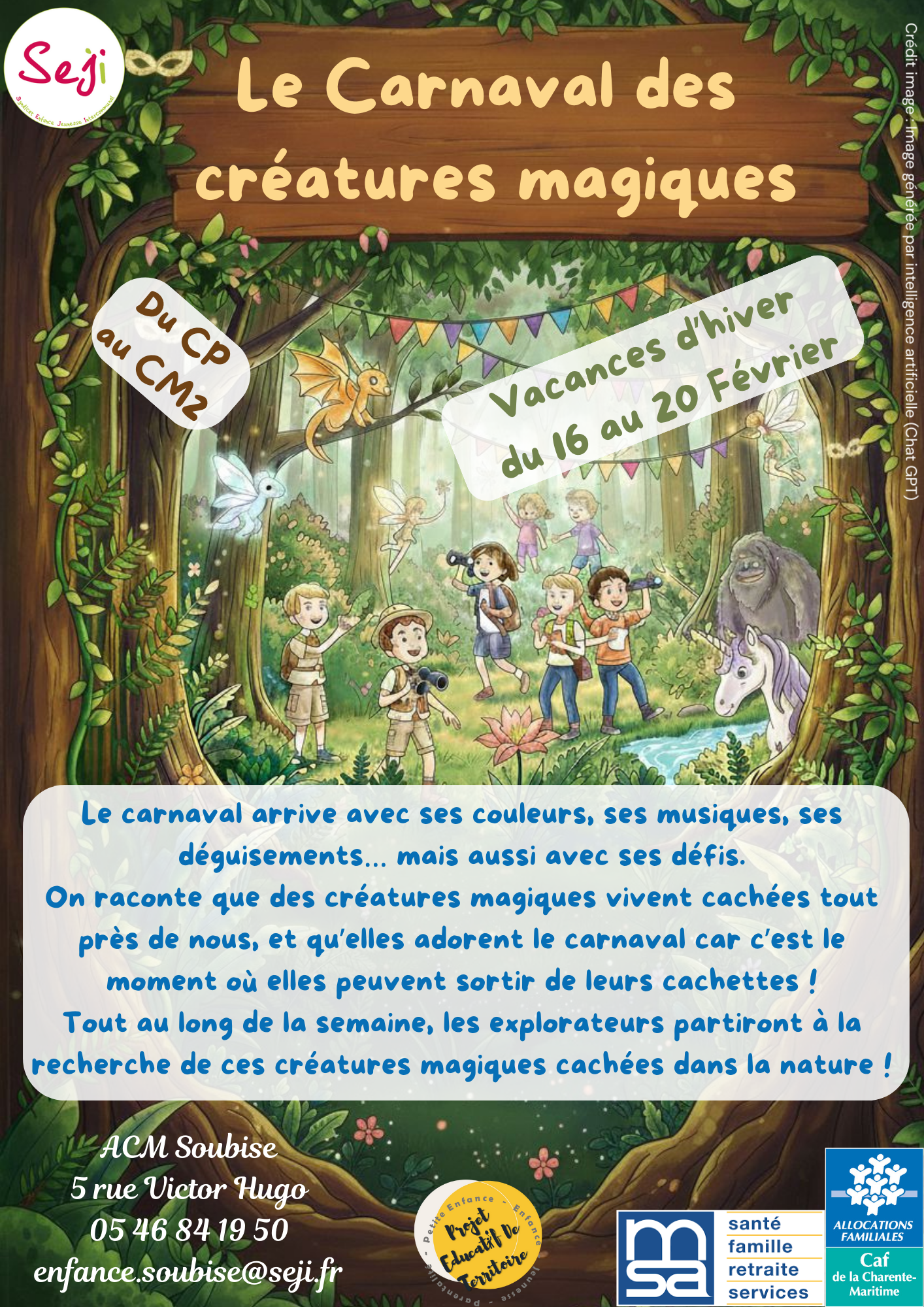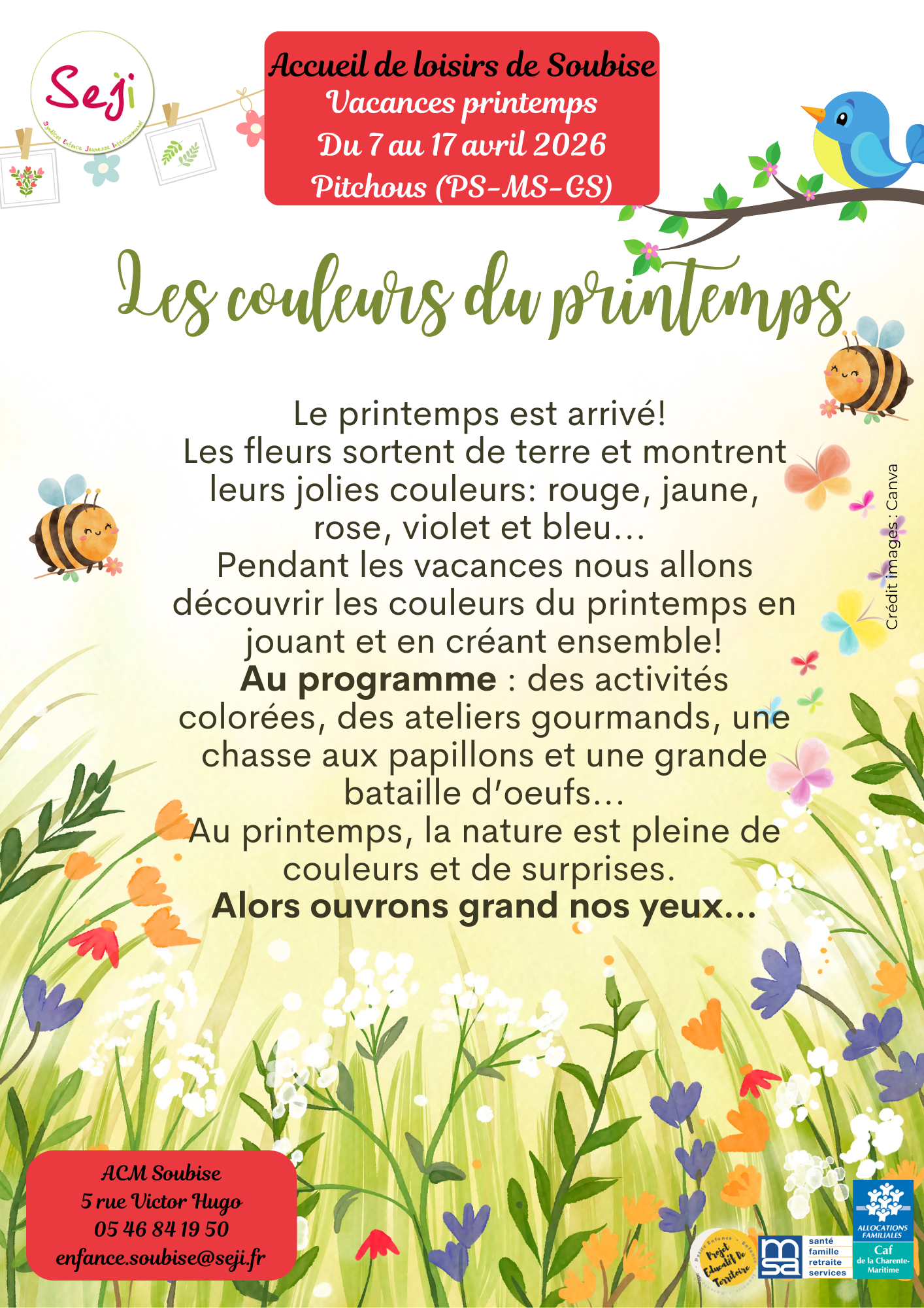 L’équipe de l’accueil de loisirs et périscolaire de Soubise vous accueille du lundi au vendredi, sur les périodes scolaires et les vacances scolaires, de 7h15 à 19h00.